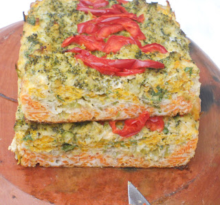 Cada verdura se prepara aparte y se reserva: a las zanahorias agregamos dos huevos batidos y condimentamos agregamos aceite y 1 cucharada de pan rallado mezclamos y vaciamos a un molde enmantequillado...Con el zapallo o calabaza el mismo procedimiento y agregamos el pan rallado y dos huevos batidos...Con la brócoli lo mismo pero agregamos 3 huevos batidos,pan rallado...a cada mezcla agregamos aceite y terminamos con pan rallado,adornar con pimentón rojo.