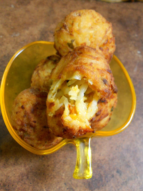 Hacer bolas juntando con las palmas de la manos y rebozar en un poco de harina,freír en abundante aceite y dejar en papel absorbente. Acompañar con ensaladas.