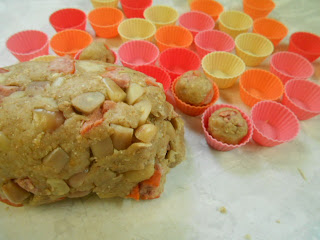 Hacer pequeñas bolitas con la masa y disponerlos en los pequeños moldes.