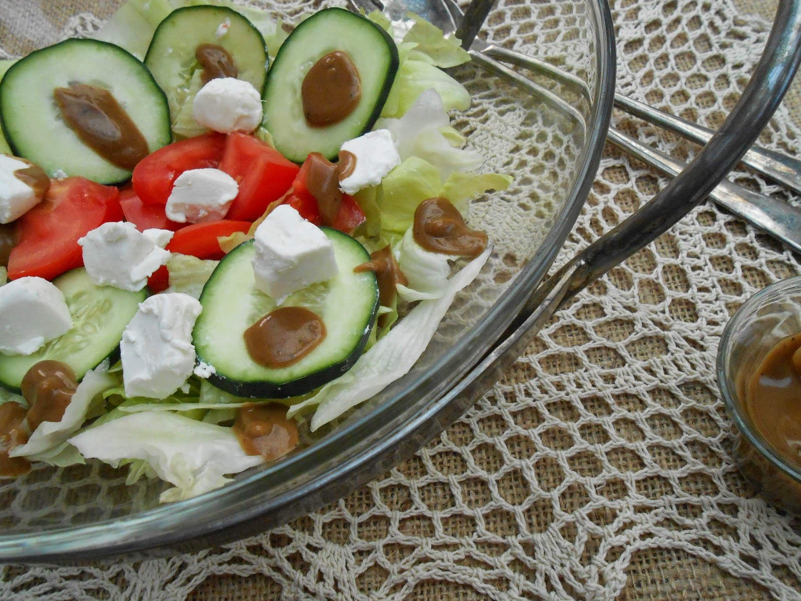 Ensalada de lechuga escarola,pepinos y tomates,agregar pequeños trozos de queso de cabra fresco y adornar con una salsa casera que preparo con crema o nata,yogurt natural,jugo de limón,aceite de oliva,mostaza y salsa de soya; todo según la cantidad de comensales.